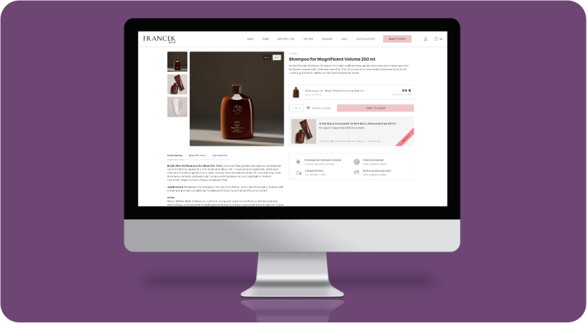 Pentru Oribe, am dezvoltat un magazin online integrat ca extensie a platformei Francek, dedicat comercializării produselor premium de îngrijire a părului. Oribe este un brand internațional de lux, iar platforma a fost construită pentru a reflecta poziționarea high-end și standardele pieței din Germania.